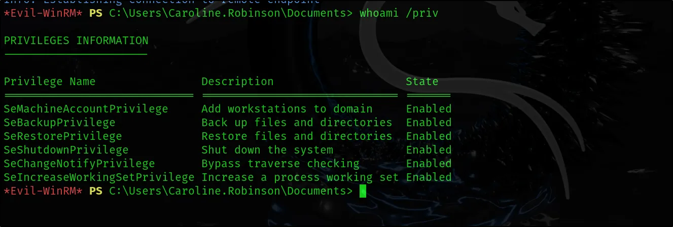 evil-winrm -i 10.10.116.118 -u Caroline.Robinson -p ‘Pass123.’